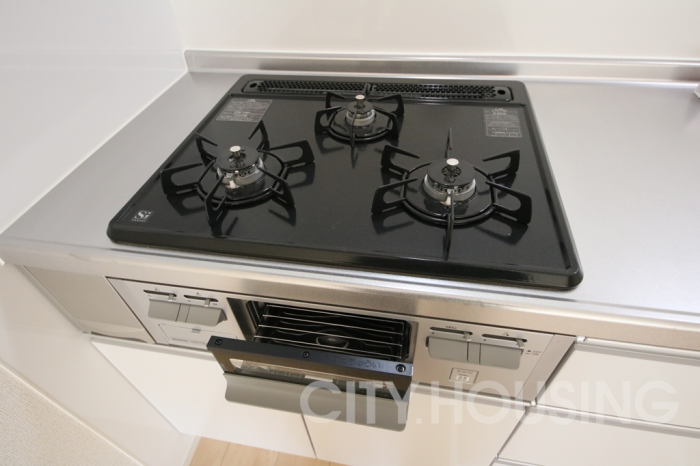 3口コンロのキッチンはお料理好きの方にうれしい設備ですね。