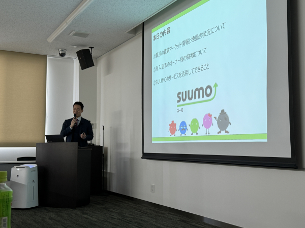 第二部ではポータルサイト「suumo」を運営されております株式会社リクルートの高木様から「プロの目にはどう映る?徳島の賃貸マーケティングと顧客動向ののリアル」と題しまして、現在の具体的な徳島の市場や動向をご説明いただきました。