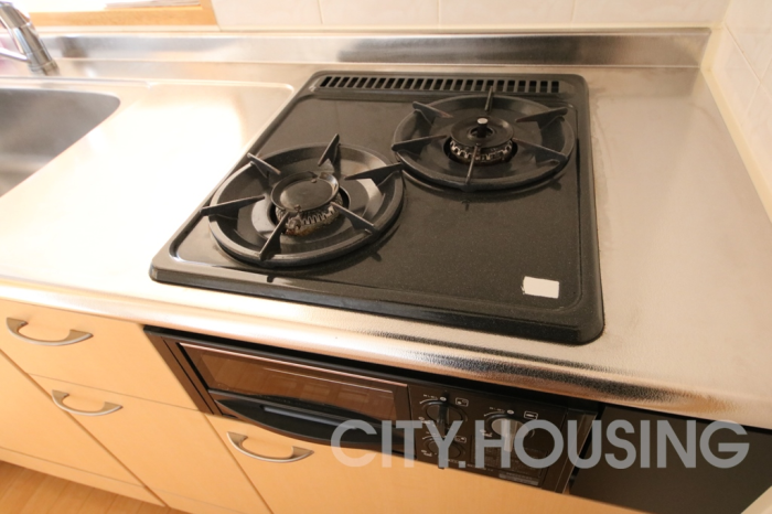 バストイレ別、室内洗濯機置き場、エアコン[2基]、ベランダバルコニー、下駄箱、脱衣所、洗髪洗面台、独立洗面台、照明器具、室内物干し、温水洗浄便座、暖房便座、浴室内乾燥機、システムキッチン、対面式キッチン、給湯[LPガス]、ガス調理器具[2ヶ口]、CATV(基本ch)、モニタ付インターホン、角部屋、調理器具